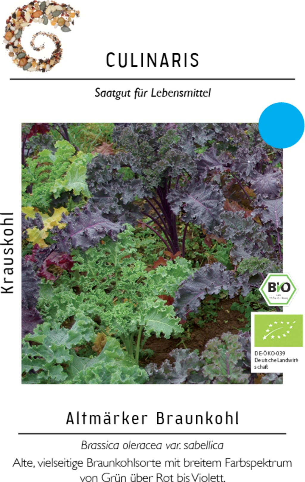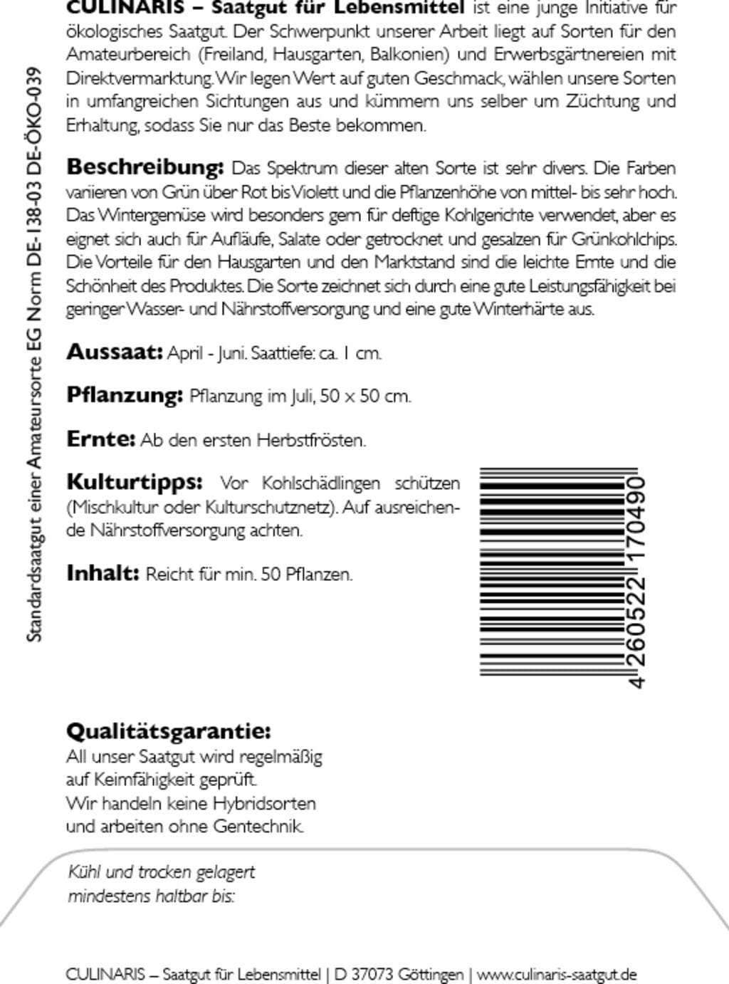 Der Krauskohl „Altmärker Braunkohl“ ist eine alte, robuste Sorte, die durch ihr buntes Blattwerk von grün bis violett auffällt. Die Pflanzen sind winterhart, pflegeleicht und vielseitig verwendbar. Ob klassisch als Kohlgericht, in Aufläufen, als frischer Salat oder getrocknet zu Chips – diese Sorte ist ideal für Hausgarten und Marktstand.