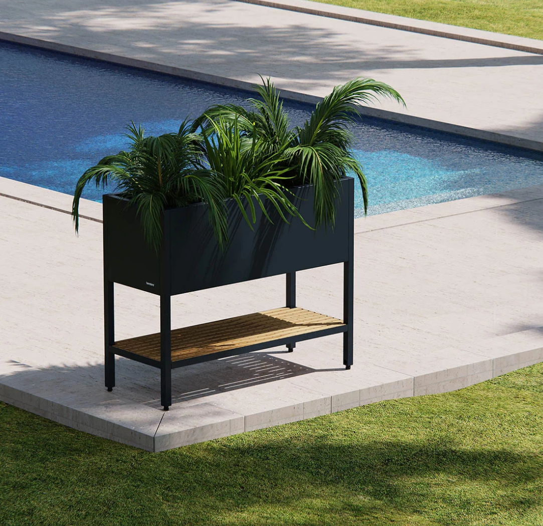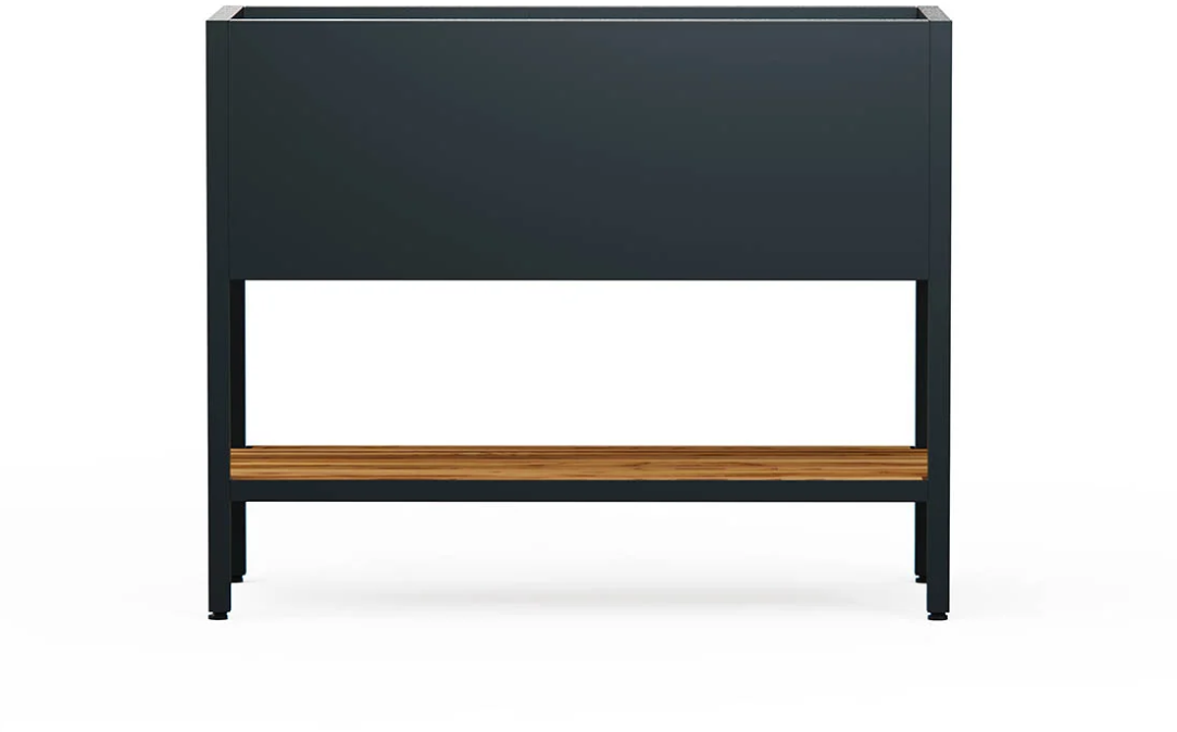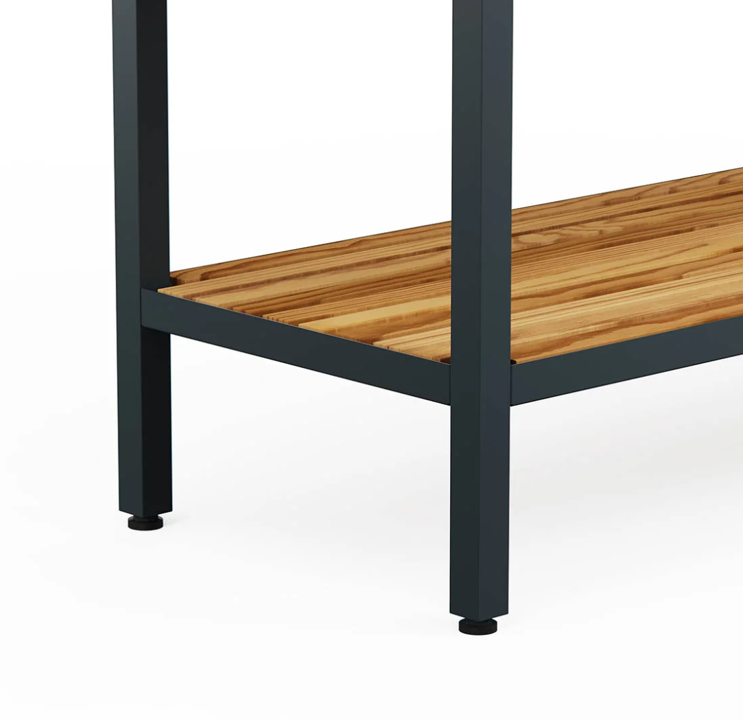 Minimalistisch-modernes Design trifft auf funktionale Ästhetik. Das aus pulverbeschichtetem, feuerverzinktem Stahl mit einer Ablage aus thermisch behandeltem Kiefernholz begeistert nicht nur optisch, sondern auch mit hochwertiger Material- & Verarbeitungsqualität.