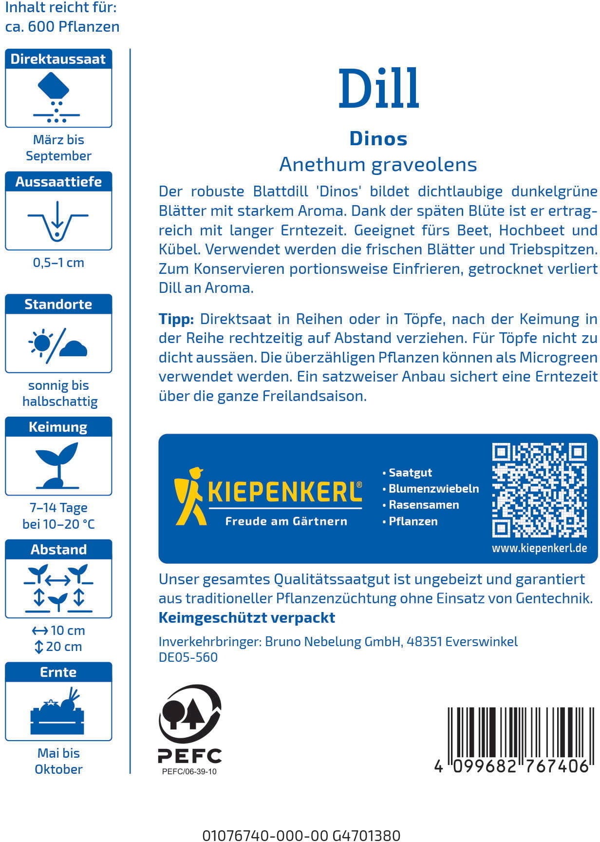 Der Blattdill „Dinos“ begeistert mit seinem intensiven Aroma und den dichten, dunkelgrünen Blättern. Ideal für Salate, Soßen, Suppen oder als Garnitur für Fisch- und Kartoffelgerichte. Durch die späte Blüte und lange Erntezeit hast du über mehrere Monate hinweg frisches Dillgrün direkt aus dem Garten oder vom Balkon – ein echtes Must-Have für aromatische Küche und frische Kräuterfreude!