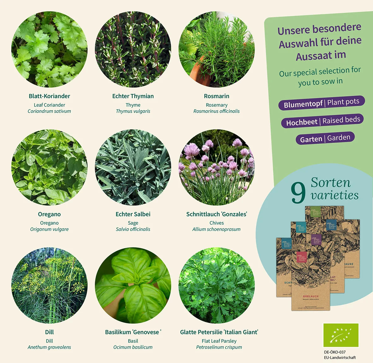 - 9 verschiedene Bio-Kräuter-Saatgutsorten