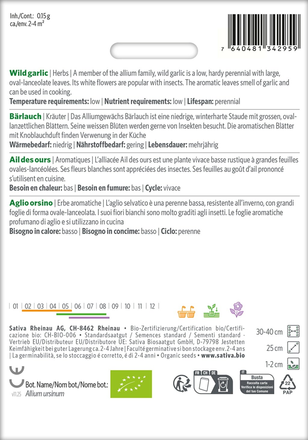 Bärlauch ist eine winterharte Staude mit großen, aromatischen Blättern, die in der Küche vielseitig verwendet werden können. Er bevorzugt feuchte, halbschattige Standorte, wird im Herbst ausgesät und vermehrt sich bei passenden Bedingungen schnell zu dichten Horsten.
