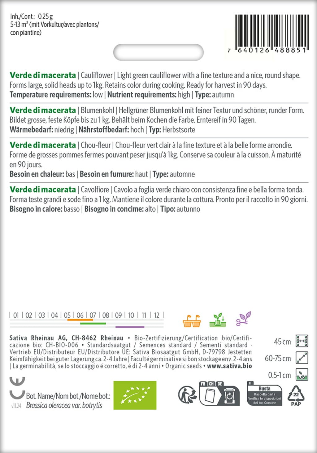 Der hellgrüne Blumenkohl Verde di Macerata überzeugt mit seiner feinen Textur und einer schön runden, kompakten Form. Er bildet grosse, feste Köpfe bis zu 1 kg und behält auch beim Kochen seine attraktive Farbe. Nach rund 90 Tagen ist er erntereif und stammt aus sorgfältiger Erhaltungszüchtung von Sativa in Rheinau.