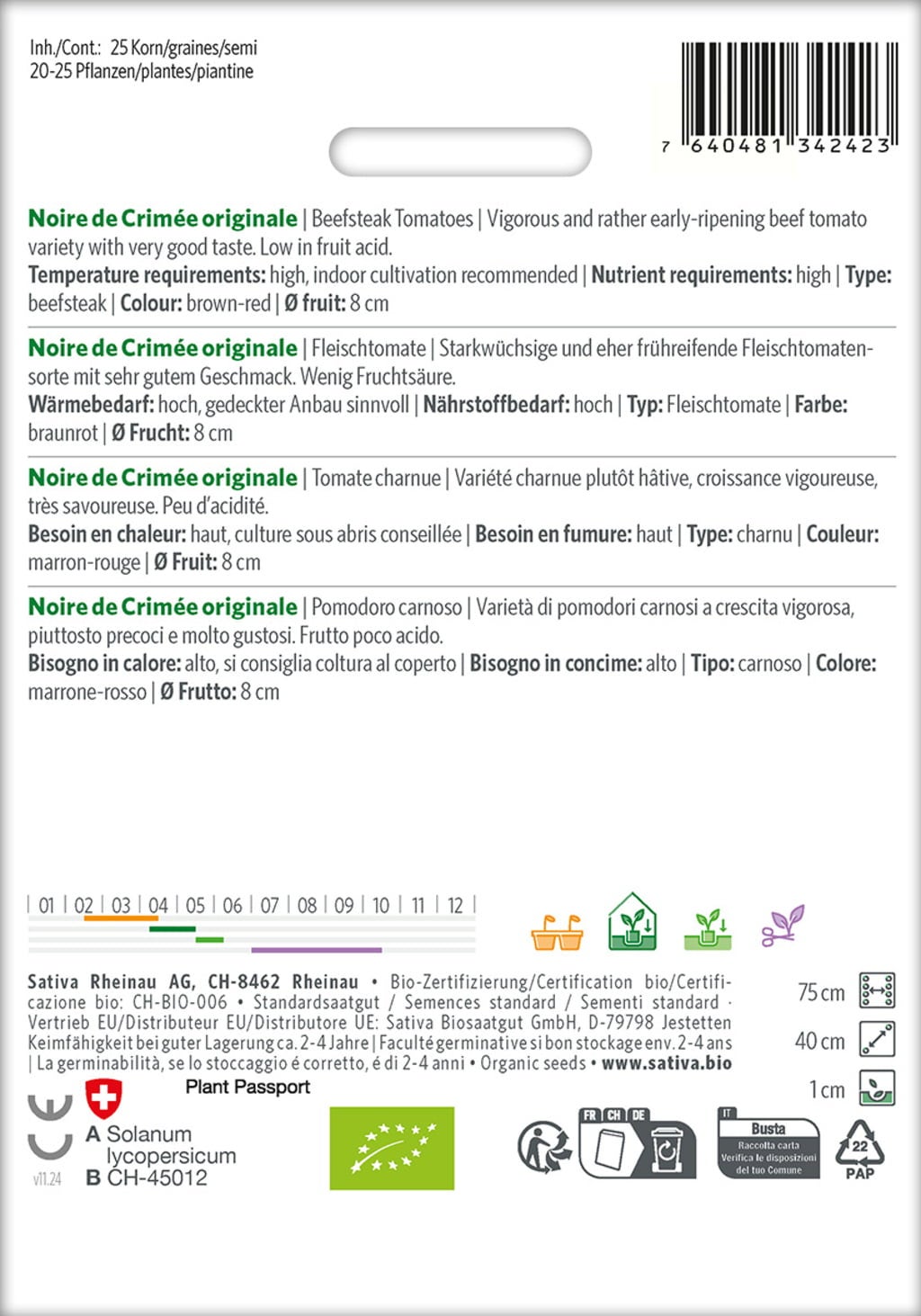 Die Fleischtomate Noire de Crimée originale überzeugt mit kräftigem Wuchs und früher Reife. Ihre Früchte bestechen durch ausgezeichneten Geschmack und nur wenig Fruchtsäure. Ideal für alle, die aromatische, vollmundige Tomaten lieben.
