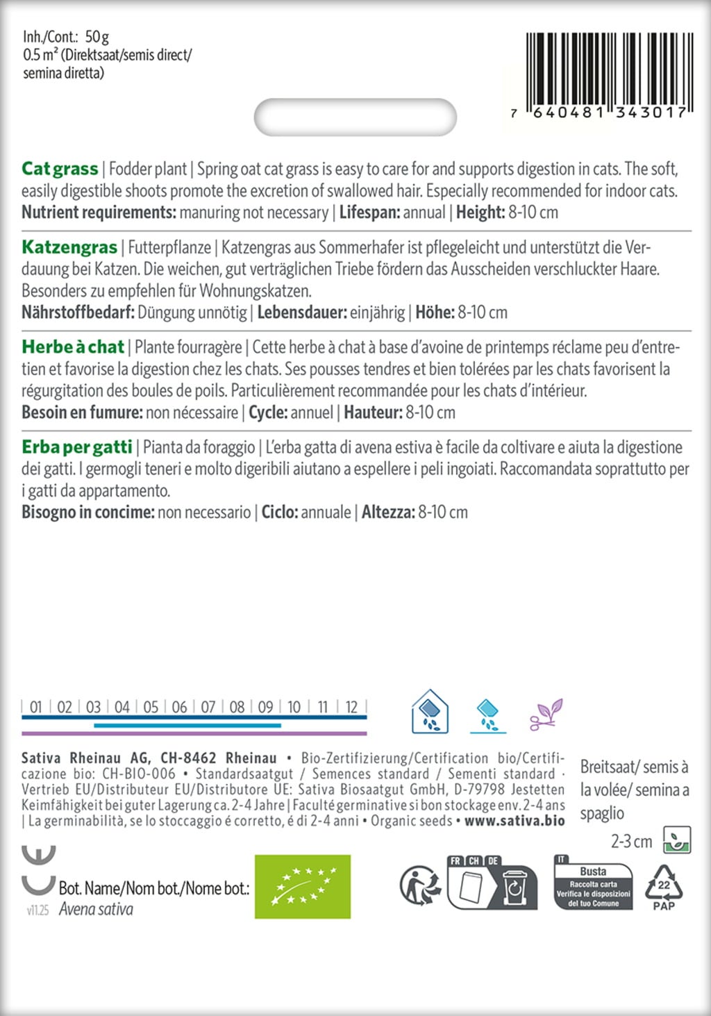 Katzengras aus Sommerhafer ist eine pflegeleichte Futterpflanze, die Katzen bei der Verdauung unterstützt und das Ausscheiden verschluckter Haare erleichtert. Ideal für alle Wohnungskatzen, die keine Möglichkeit zum Grasfressen draußen haben.