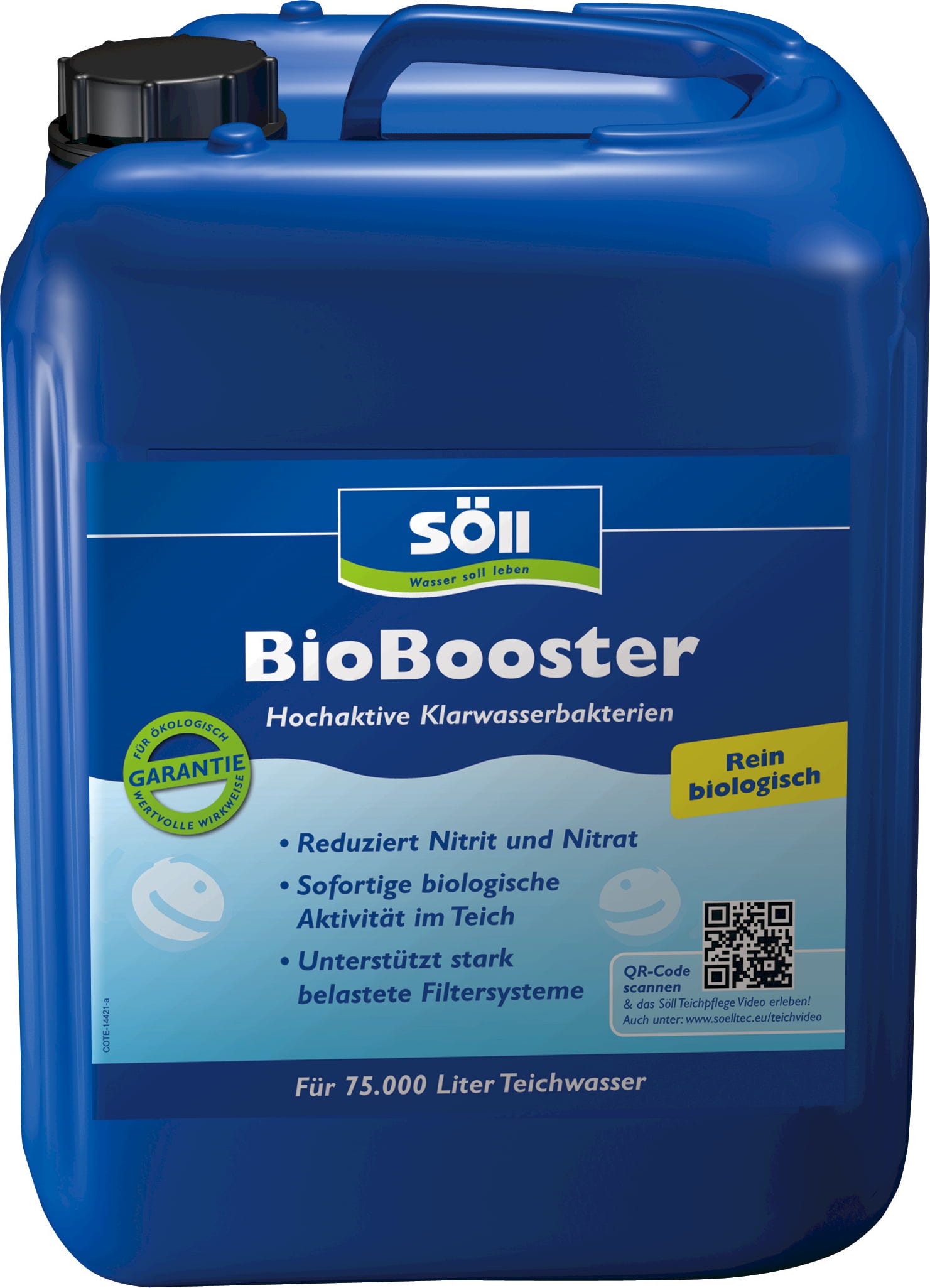 Der BioBooster von Söll ist ein Präparat, das mithilfe von hochswirksamen Bakterienkulturen die biologische Beschaffenheit des Teichwassers rapide stabilisiert. Er baut nicht nur organische Trübstoffe ab, sondern auch anorganische Verbindungen. Auch die Nitrit- und Nitratgehalte im Wasser werden durch ihn nachhaltig gesenkt. Das Produkt ist mit unzähligen Klarwasserbakterien angereichert. Diese verbessern die Wasserqualität spürbar und unterstützen die biologische Selbstreinigung des Teiches.