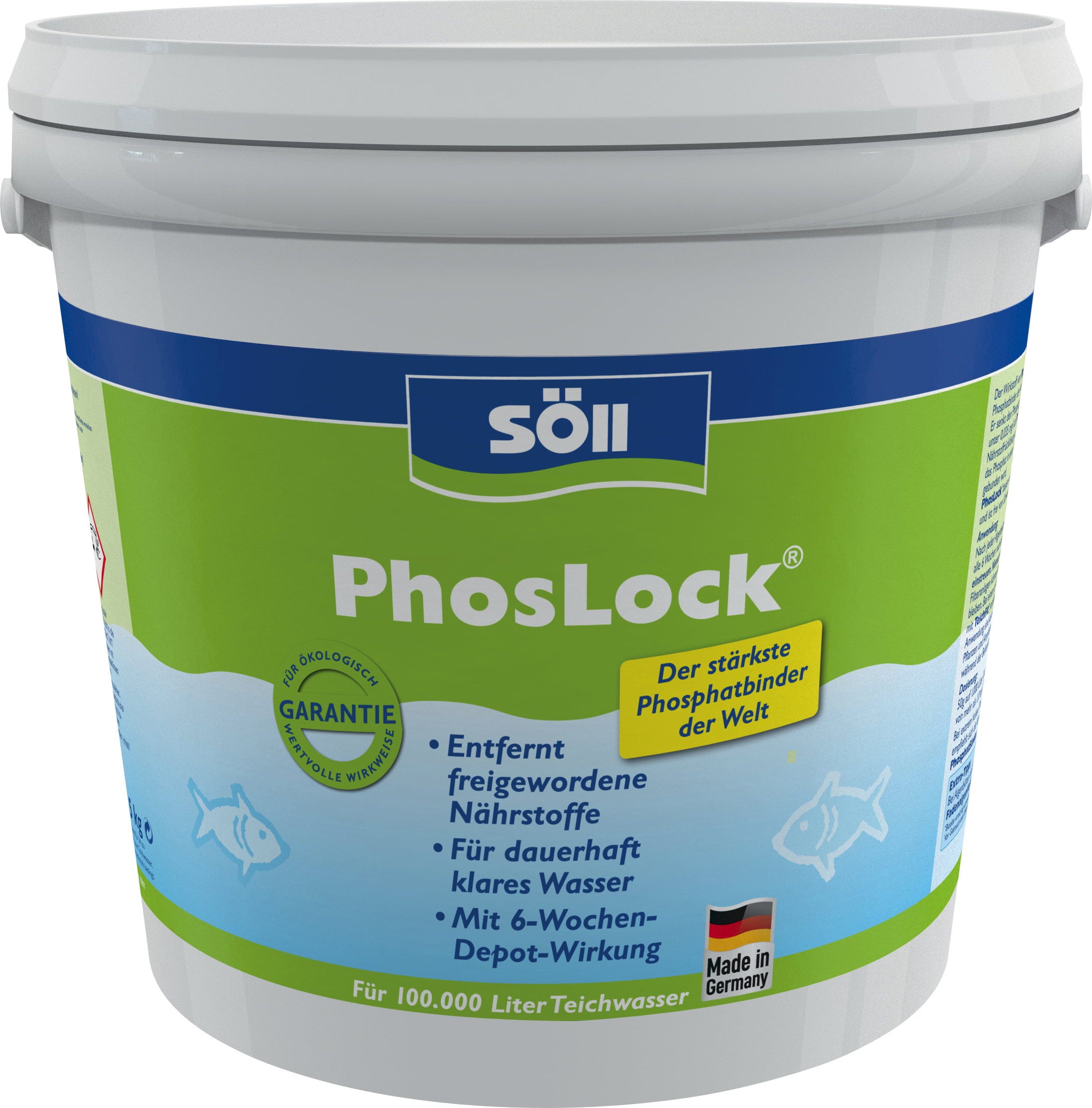 Der PhosLock soll Söll zufolge der stärkste Phosphatbinder der Welt sein. Seine mineralische Rezeptur enthält keine Schwermetalle und ist bei einer richtigen Anwendung und Dosierung für Fische, Pflanzen und andere Teichbewohner unbedenklich. PhosLock verhindert, dass sich die Nährstoffe aus dem Teichschlamm rückbilden, indem er das Phosphat in einem Mineral bindet, welches im Wasser nicht löslich ist.