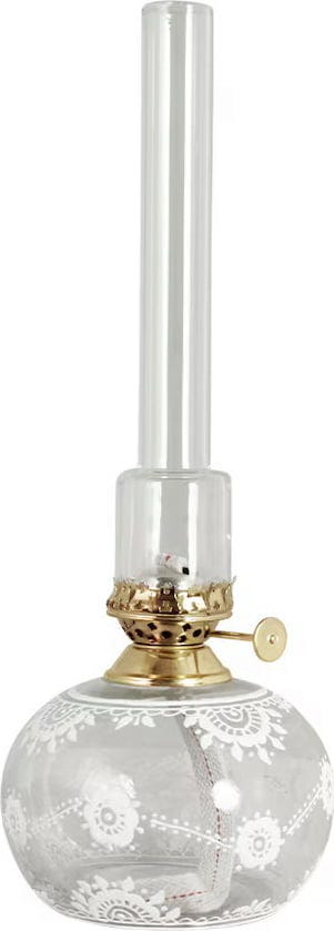 Die Petroleumlampe Marja Oval in Weiß vereint nostalgische Eleganz mit modernem Flair. Das runde Klarglas ist kunstvoll mit zarten Blumen verziert und wird von einem edlen Messingbrenner sowie einem Brennerrohr aus Glas ergänzt. Sie verleiht jedem Raum ein warmes, romantisches Licht und passt sowohl zu klassischen als auch zu modernen Einrichtungen.
