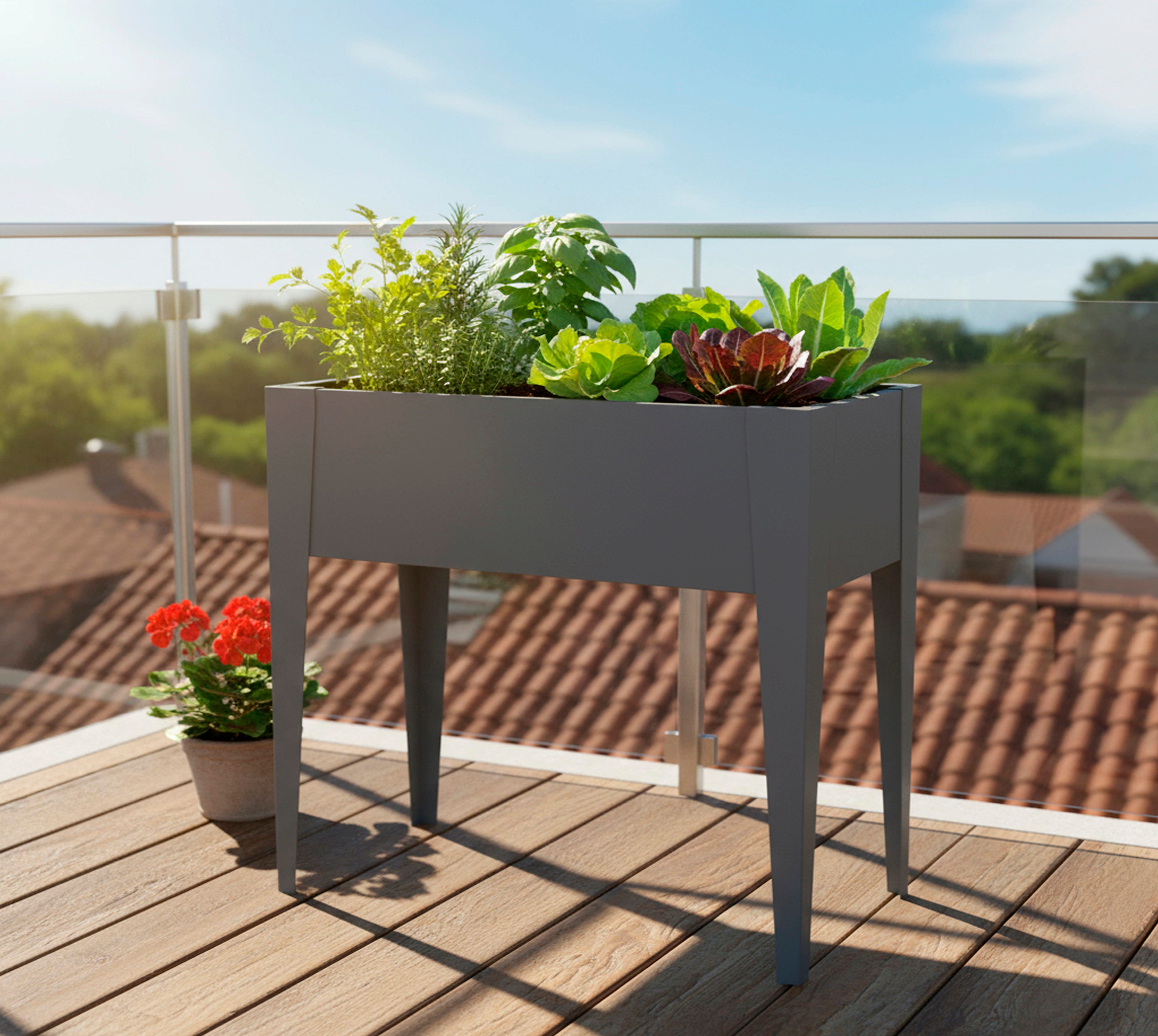 Das moderne und ansprechende Design aus pulverbeschichtetem Stahl eignet sich sowohl als Hochbeet als auch als Pflanzkasten. Seine ergonomische Arbeitshöhe und das schlanke Format machen es zur idealen Lösung für stilvolles Gärtnern auf Balkon, Terrasse oder im kleinen Stadtgarten. Verdura zeichnet sich außerdem durch Robustheit, Witterungsbeständigkeit und Langlebigkeit aus.