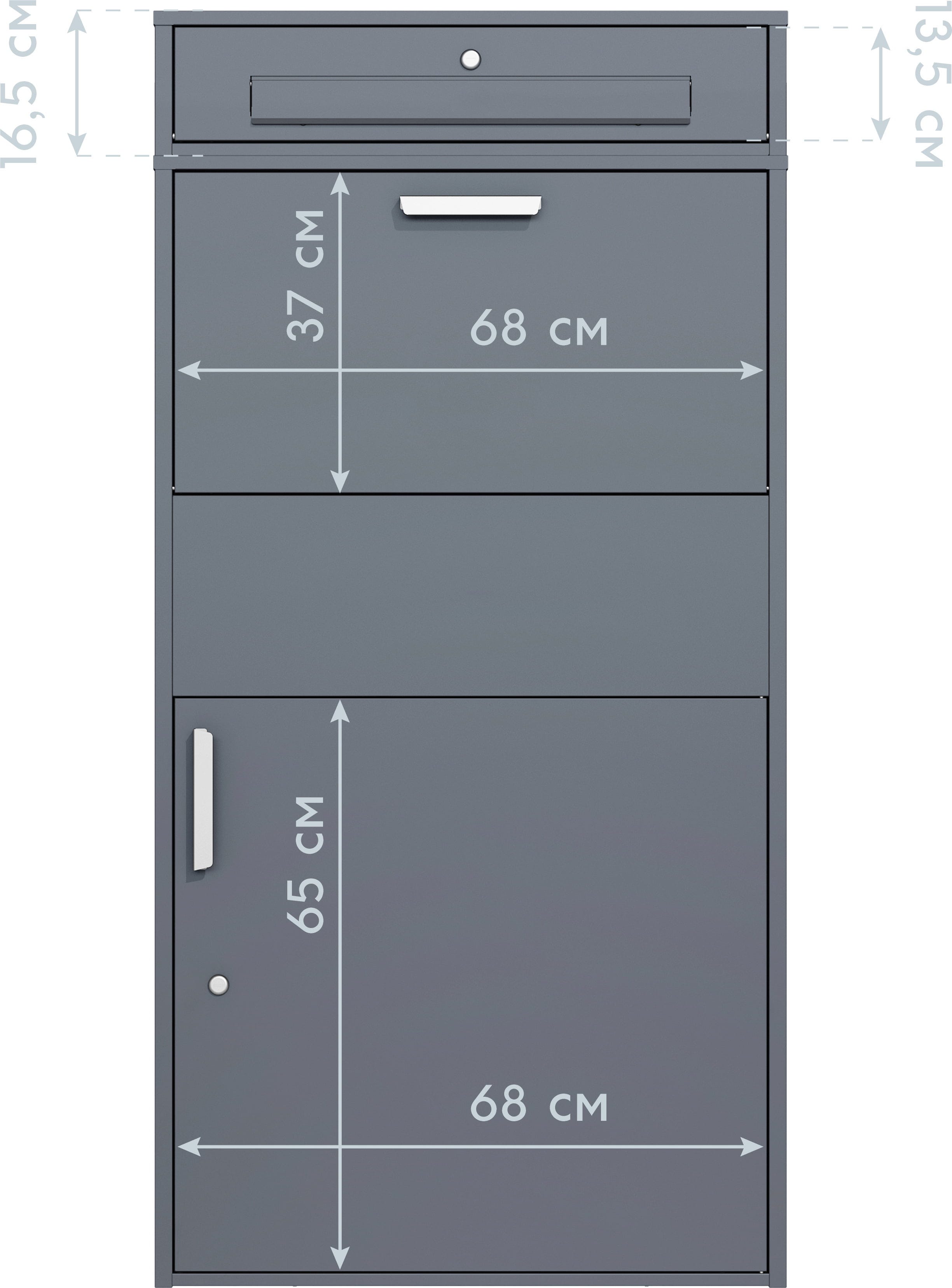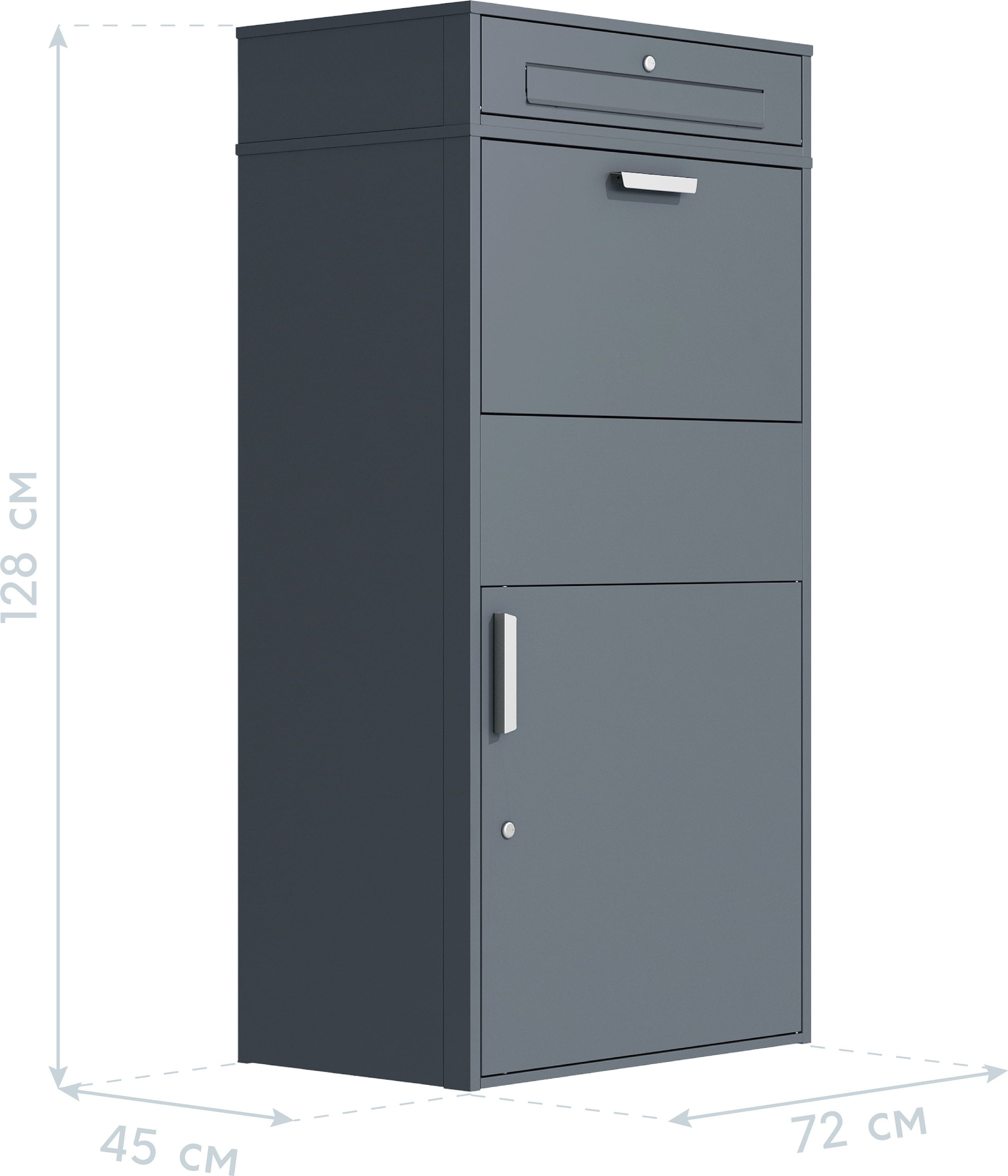 Paketbox Pavo ist ein durchdachtes System mit drei Fächern: Briefschlitz, Einlegefach und Hauptfach. Es zeichnet sich durch seine Robustheit sowie Witterungsbeständigkeit aus und ist sicher verschließbar. Nach dem Einlegen eines Pakets und dem Schließen des Fachs, fällt die Sendung direkt in das gesicherte Hauptfach. Zudem ist die Paketbox durch Schrauben im Boden zu verankern.